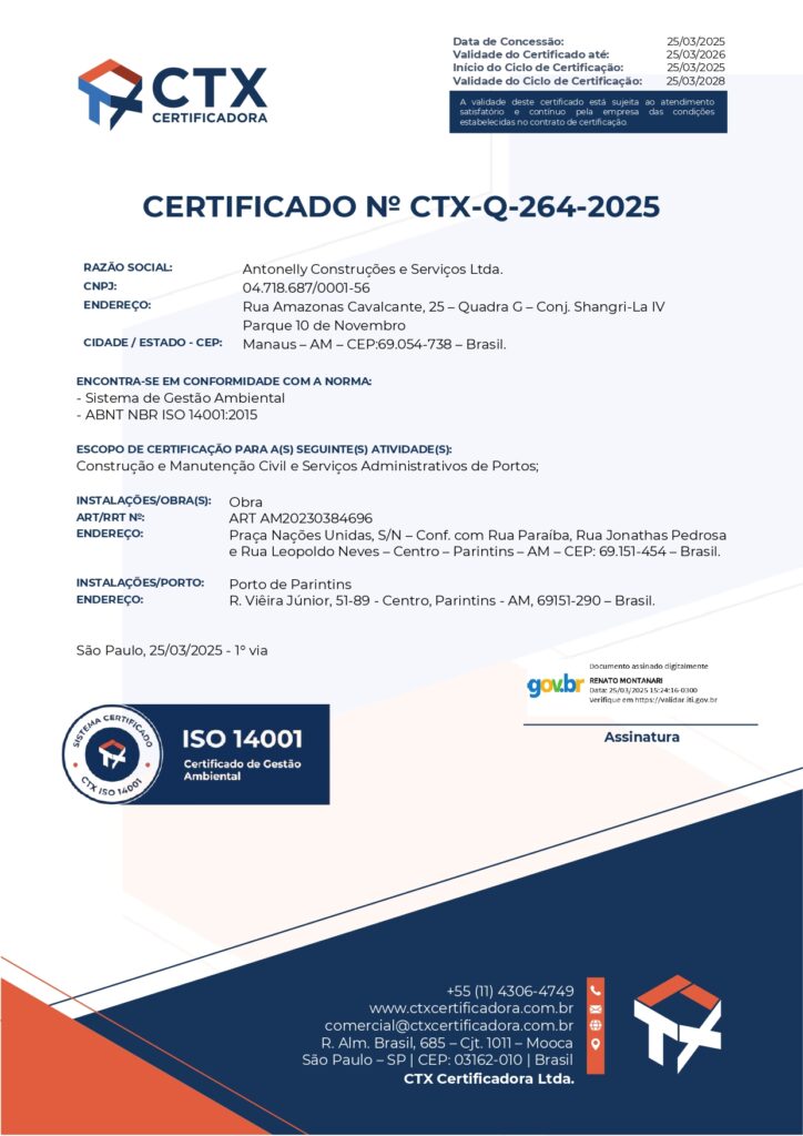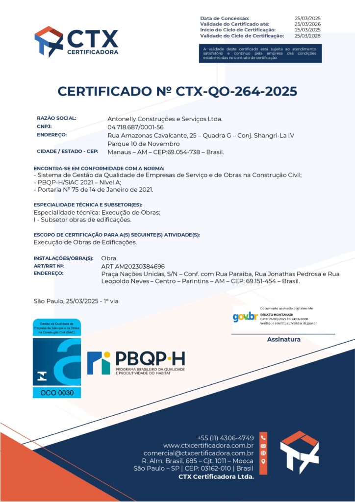 A Antonelly Construções e Serviços Ltda possui um Sistema de Gestão estruturado e alinhado às melhores práticas de governança corporativa, qualidade, meio ambiente, saúde, segurança e integridade, atuando de forma ética, transparente e responsável em todas as suas operações.